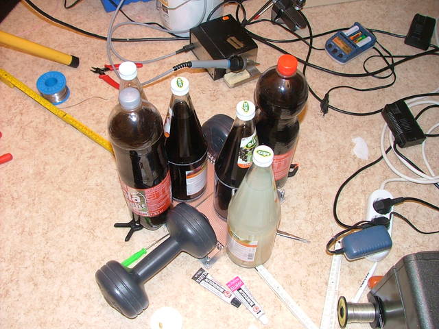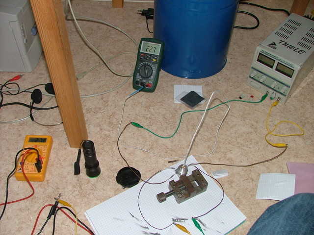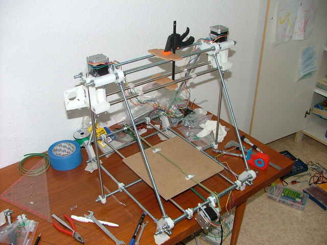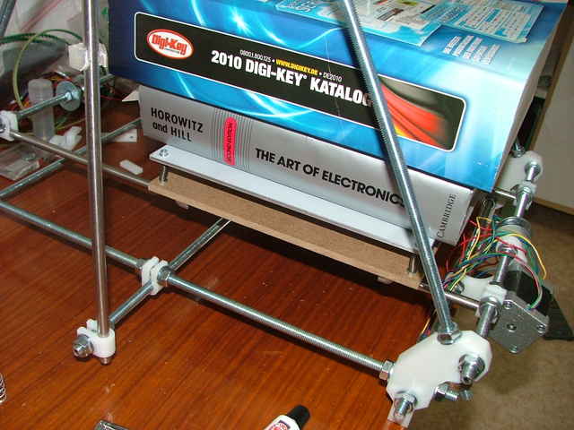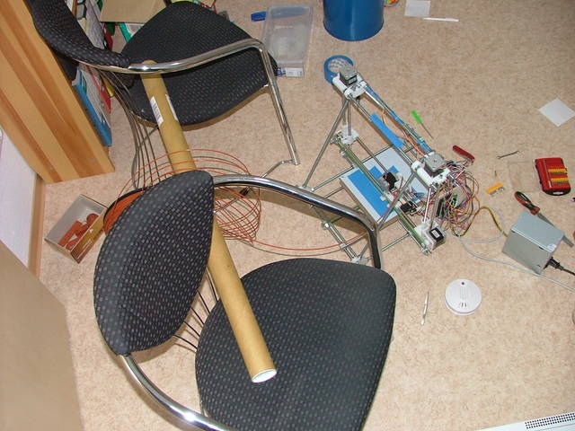This is gluing the board to the bed using two component epoxy. It works quite well although the next time I would take more glue to bring it into better thermal contact everywhere. | This is the poor mans setup for unspooling PLA. |