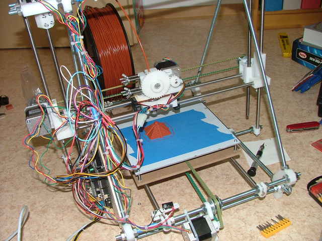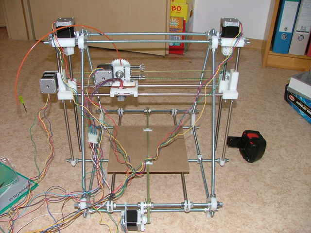 Here you see the result of the first few hours. Unfortunately I had a delivery delay in the so called "idler block" of the extruder which is missing in this image. Also the Z-Axis threaded rods are missing. A lot of time was spend to learn about the different variants of the machine and finding out which one I was actually building here. The kit contained "Wades extruder" for extrusion of the filament and also Arcols v4 hotend for heating it up and reducing its diameter using a nozzle. Arcols hotend is not assembled yet here because at that stage of development I didn't yet know that I have arcols hotend and thus did not have documentation about how to assemble it :) |
