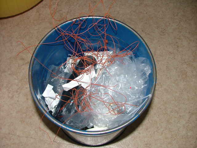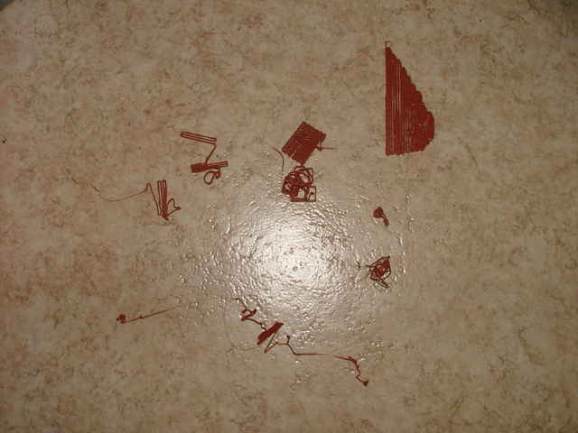 Oh well... Extrusion tests after extrusion tests... | Initial garbage. The problem was that the extruder jammed. In order to be able to regularly unmount the extruder wheel to clean the teeth I had to rotate my extruder 180 degrees. After cleaning the extruder it started to work quite well. The next problem was that the bottom layer didn't stick on the ground. After using blue masking tape cleaned with aceton it started to stick really good. Another point was that the nozzle must quite kiss the ground and not stay a millimeter or so above it. All has to be learned first :) |