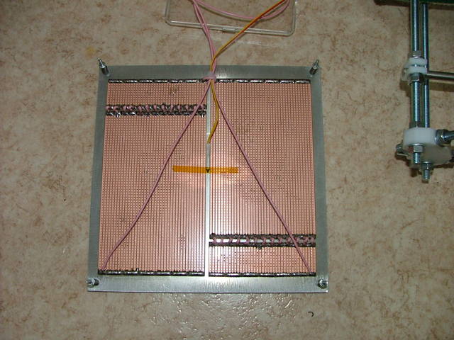 Here you see a bad effect called warping. It results from a non-heated bed as I use here. After some layers the material finally popped off and raised up. That made it crash into my air blowers and also into the nozzle. The part and the machine were ruined. Thus the decision was made that the bed has to be heated. | I chose a simple variant for heating the bed. Here you see simple raster boards wired together into a giant short-cut circuit. It was carefully designed to draw just the allowed maximum of 11 amperes at 12V from the ramps board. |