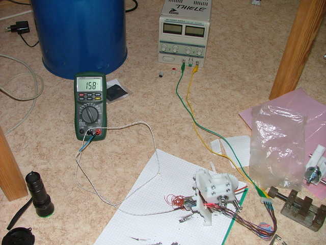 Here the hotend is cemented. power was applied to the power resistor using a laboratory power supply. the yellow multimeter shows the resistance of the thermistor. the green multimeter has a thermoprobe attached. luckily it fits straight through the filament hole downto the tip of the nozzle. this way I was manually regulating temperature with the power supply until the fire cement was hard. |