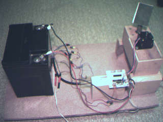 Akku, Schrittmotorsteuerung und Vermessungsgeraet auf einem Rollbrett |