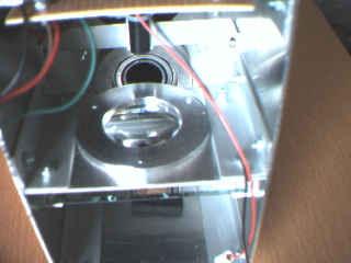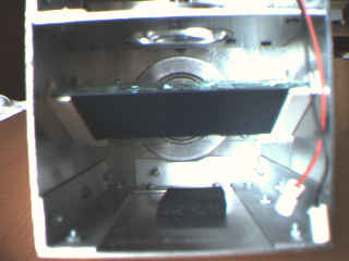 Ansicht von unten. Erkennbar ist die Linse, der Laser und die Platine, auf der spaeter der Fototransistor zum Erkennen des rueckfallenden Laserstrahls montiert wird. | Hier sieht man den um 45 Grad abgelenkten Spiegel von hinten, ausserdem ist der Laserlichtabsorber gut zu erkennen. |