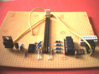 Die Stiftleiste in der Mitte wird mittels Flachbandkabel an die IO Karte angeschlossen. nach rechts werden 4 Datenbits zunaechst via 10 kOhm auf 0V gezogen, dann optoelektronisch abgetrennt. 3 der Ausgaenge des Optokopplers laufen direkt auf die weisse Buchsenleiste. Einer laeuft auf die Basis von 3 parallelen Transistoren. Auf diese weisse wollte ich eine Abschaltung der Schrittmotorsteuerung ermoeglichen; selbige wird in die Buchsenleiste gesteckt. Ich betrachte dies alles als Murx! Daher habe ich mich entschlossen, die Schrittmotorsteuerungen selber zu bauen, und die Aufgaben dieser Platine zu verteilen und nicht alles zu integrieren versuchen. | Auf der Linken Seite ist eine Verstaerkerschaltung und ein Festspannungsregler zu sehen, damit sollte man den Laser an- und ausschalten koennen. |