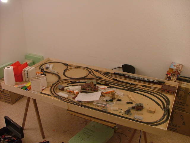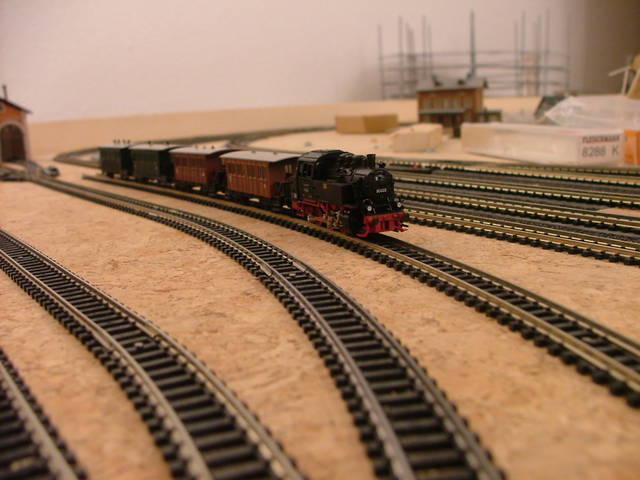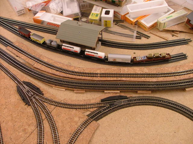 Die untere Ebene aus anderer Perspektive. Links der kleine Kreisverkehr ist eine Spezialität meiner Anlage. Mit diesem Kreis kann man Züge mit minimalem Platzbedarf wenden. | Güterbahnhof oder Abstellgleis. Die Dreierweichen sind zwar sehr Platzsparend, jedoch habe ich bei manchen Lokomotiven relativ häufig Kurzschlüsse beim Überfahren der Weiche. Dann schaltet der Dekoder ab, was nicht so schön ist, da dann alles stehen bleibt. |