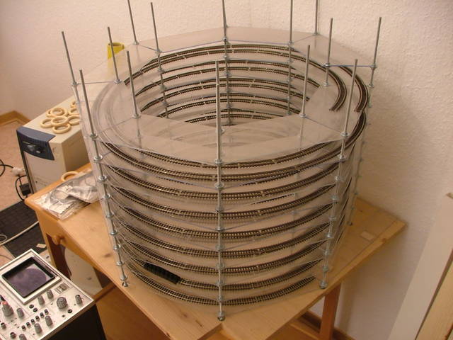 Dies ist die sogenannte "untere Ebene". Die Anlage besteht theoretisch aus zwei Ebenen. In den vier Ecken des Bretts werden Holzpflöcke installiert und danach kommt oben nochmal das gleiche Brett drauf. | Mittels dieser Wendelschleife wird dann die untere mit der oberen Ebene verbunden. Die Schleife existiert schon, aber auf der oberen Ebene ist lediglich ein Loch. |