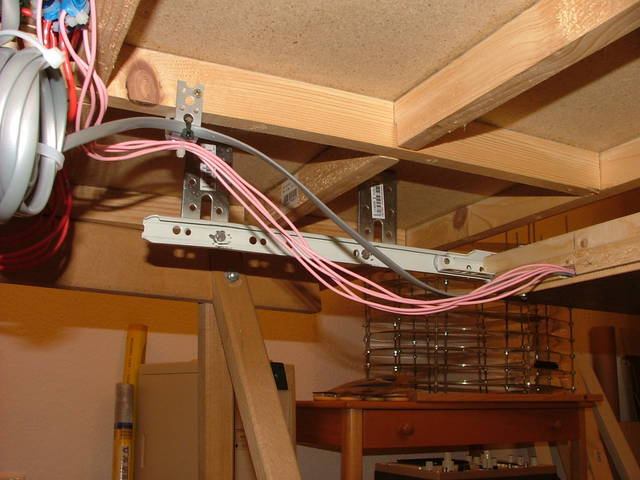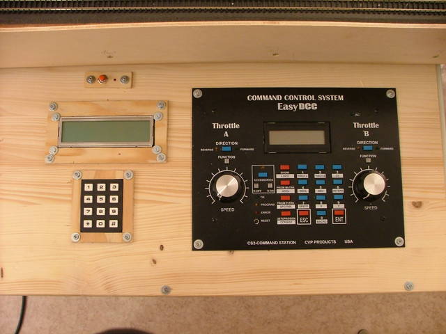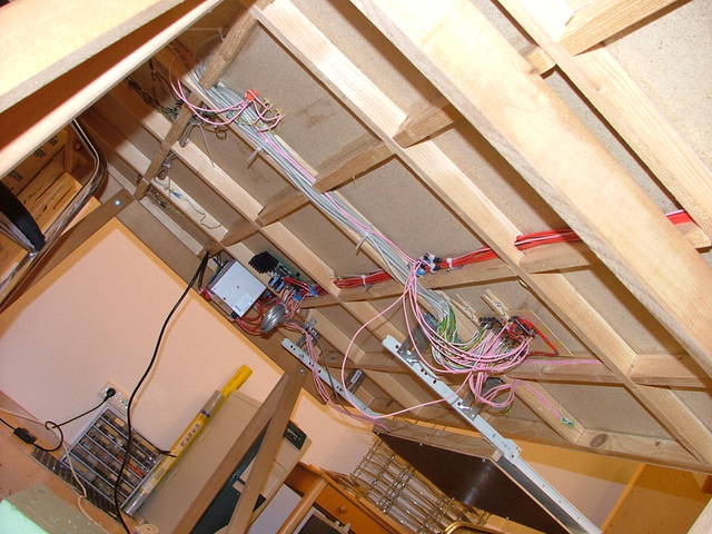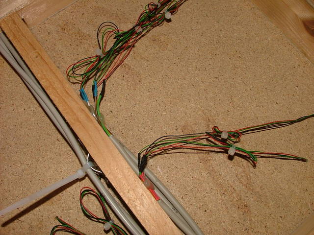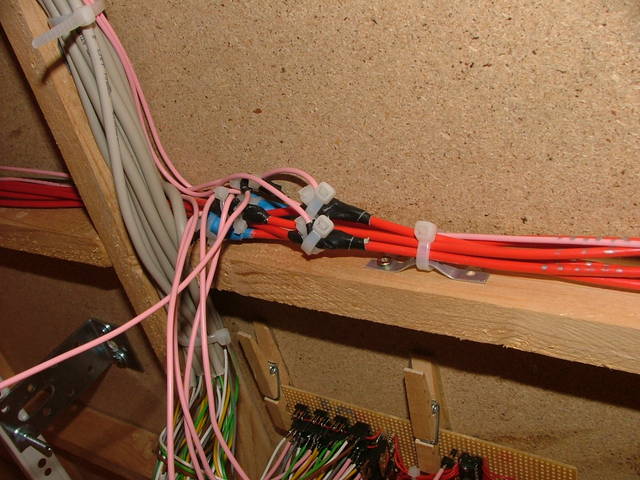 Rechts ein EasyDCC Control Panel. Das Zeug links davon ist alles von mir. Ich habe ein eigenes Mikrokontrollernetzwerk aufgebaut. Der hier gezeigte Teilnehmer ist eine Tastatur mit Display. Hier kann man alle Weichen schalten. | Das Unterleben. Der rote Strang ist die Haupversorgung bestehend aus Masse, 5VDC, 12VDC, 24VDC, Reset, Track 1 und 2. |
