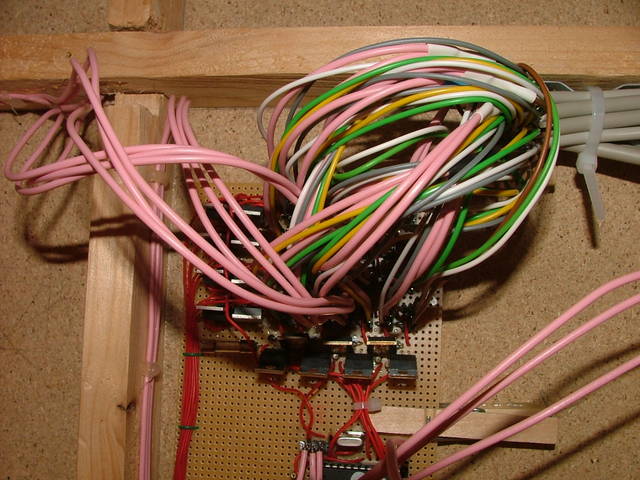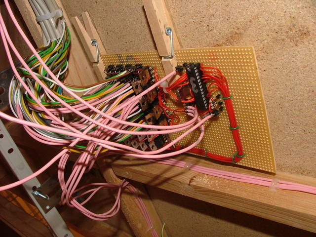 Die Weichenplatine. Sie kann 28 Weichen schalten. Eine Dreierweiche zählt jedoch doppelt. Die Weichen werden hier als Matrix angesteuert um Transistoren zu sparen. | Kritikwürdig ist die Anschlussart der Weichen. Ich hätte sie irgendwie bündeln müssen. Wer weiss. |