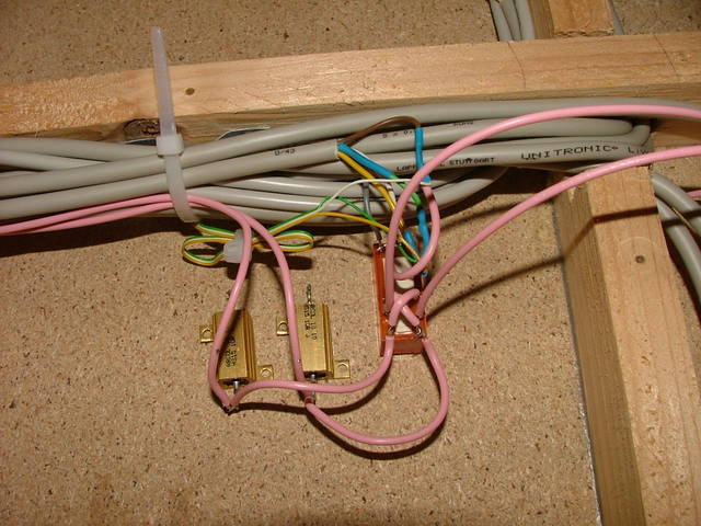 2,5mm² haben die roten Drähte. Ich zwicke die Isolierung an, löte ein anzuschließendes Kabel dazu, umwickle alles mit Klebeband und mache Kabelbinder dran, damit das Klebeband nicht ab geht. | Das bistabile Relais, welches die Polarität der Wendeschleife festlegt wird wie eine Weiche angesteuert. Die Widerstände brauchte ich doch nicht. Ich wollte die Versorung im inneren des Wendekreises drosseln, aber das war Unsinn. |