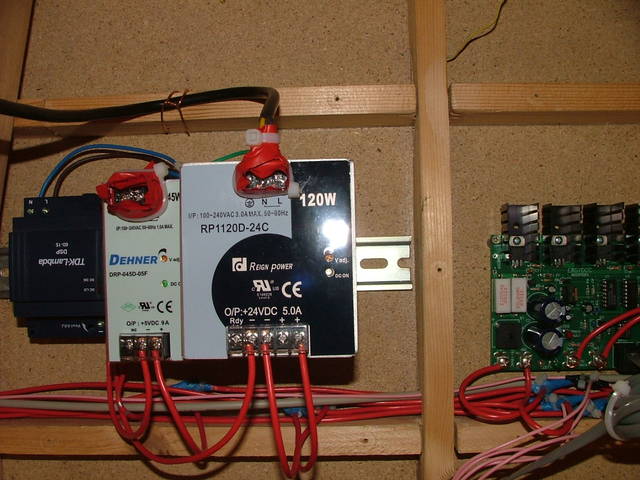 Diverse Weichen | Die Netzteile. Links 15V, dann 5V, dann 24V. Wechselspannung gibt es an meiner Modellbahn nirgends. |