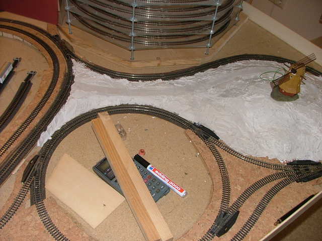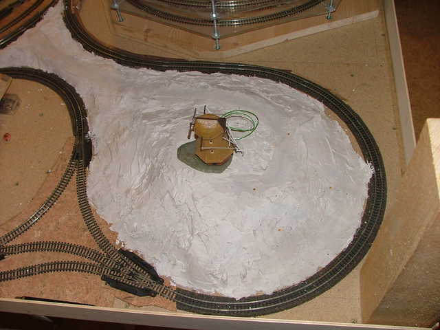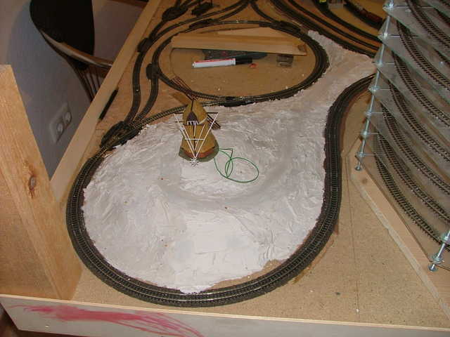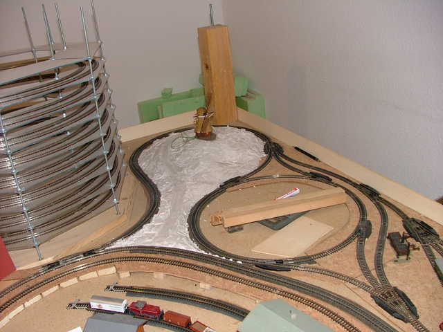 Sehr viel Möglichkeiten, hohe Berge oder überhaupt Höhenunterschiede unterzubringen gibt es auf meiner Bahn nicht, da einfach alles mit Schienen zugepflastert ist. Einen kleinen Berg konnte ich mir jedoch unmöglich nehmen lassen. Gebaut ist er aus relativ wenigen stehenden Vierkanthölzern mit etwa 1cm Kantenlänge. Diese wurden auf die Grundplatte geleimt. Dann kam ein engmaschiges Aludrahtnetz darüber. Ich habe es mit kleinen Nägeln auf die Vierkanthölzer genagelt. Das Aludrahtnetz sieht aus wie ein Fliegengitter aus Plastik, allerdings hatten vorangegangene Versuche mit Plastikfliegengitter keinen Erfolg gebracht, da man dieses nicht in Form biegen kann. Es geht immer wieder zurück. Mit dem Aludrahtnetz hat es dann prima geklappt. Die Wegstrecke, welche zur Mühle führt, sowie den Platz auf dem die Mühle steht, habe ich mit dünnen Holzbrettchen auf ein paar Stelzen gebaut. Dadurch wurde es möglich, dass die Fläche darüber gerade ist - wie bei einer Straße gewünscht. Als alles fertig war, habe ich es einfach mit Modellgips eingegipst. Leider ist mir erst danach aufgefallen, dass ich die Fotos vor dem Gipsen vergaß. Der Konzentrationsmangel ist wohl schicksalsbedingt bei all denen, die ihr Hobby abends als Entspannung betreiben!
