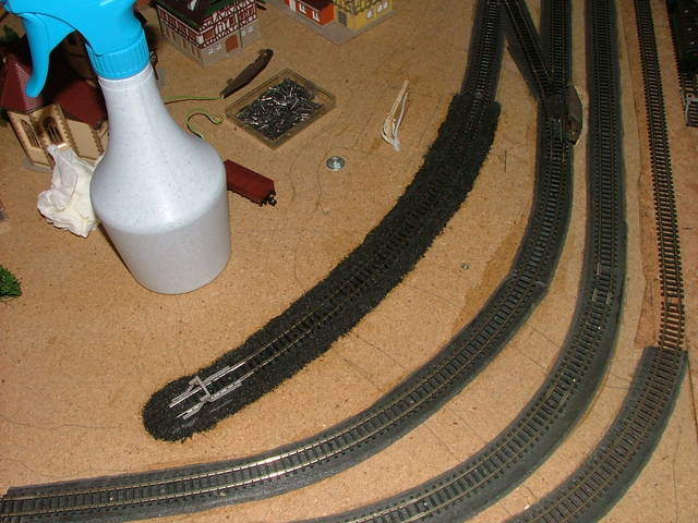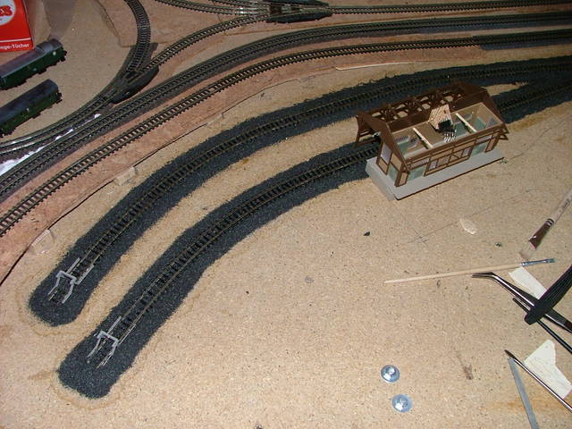 Zunächst wird Schotter auf die gleise gestreut und mit einem Pinsel so lange hin und her geschoben, bis das Ergebnis zufriedenstellend ist. Dann wird mit einer Sprühflasche Wasser mit ein bischen Spülmittel aufgesprüht. Danach wird das ganze recht großzügig in ein sehr dünnflüssiges Klebegemisch getüncht. Danach zwei Tage trocknen lassen. |