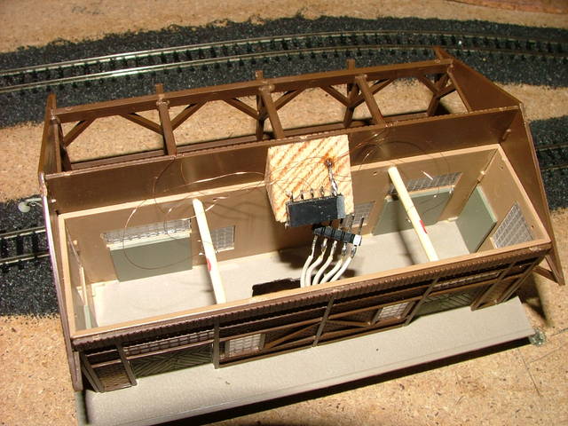 Dies ist ein kleiner Schuppen mit vier getrennt ansteuerbaren LEDs. Ich habe auf der Anlage eine Elektronik installiert, die 90 LEDs einzeln ein- und ausschalten kann. Dieses mit nur 10 Adern (Charlieplexing Verfahren). Allerdings bin ich mit der Leuchtstärke nicht einverstanden. Erhöhe ich die Versorgungsspannung, leuchten mehrere LED gleichzeitig. Wens interessiert, der sollte nach Charlieplexing suchen. Ich werde jedenfalls auf ein normales Matrixverfahren umstellen. |
