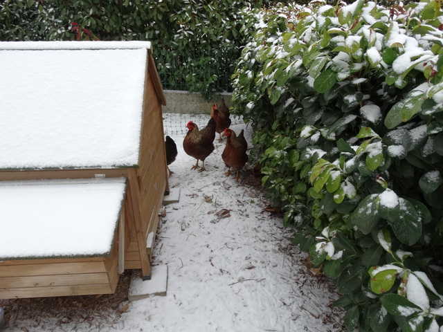 | Gesamtansicht. Links der Stall, rechts die beheizte Tränke. | Hier die mit ungefrorenem Wasser verwöhnten Hühner. |